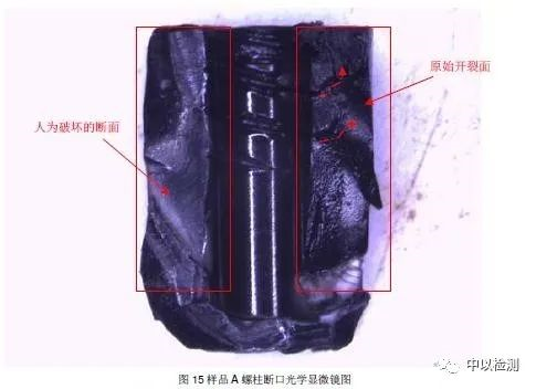 如图 15 所示,原始开裂面和人为破坏的断面有显著区别:1、原始开裂表面粗糙不平,而人为破坏的断面比较光滑;2、原始开裂面的裂纹由螺纹处起始向外引发扩展,而人为破坏的断面并无此现象。