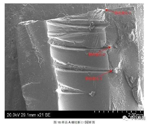 如图 16 所示,原始开裂面裂纹源头位于攻丝过程中挤压而成的螺纹槽尖端,并可见明显银纹扩展,而人为破坏的断面并未观察到银纹现象。