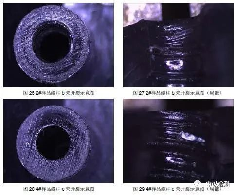 对开裂螺柱进行目视观察,可以发现螺纹沿轴向扩展,从螺柱上端面开始,至约螺柱半高处终止,贯穿螺柱内外侧。