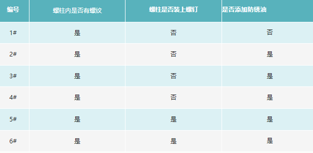 • 样品准备:对 1#、2#、4#、5#、6#样品螺柱进行镜检,确认螺柱在测试前并未开裂:使用螺丝刀、防锈油按照要求对样品进行处理,检查以保证螺钉攻入螺柱的深度一致,处理方式如表 2 所示: