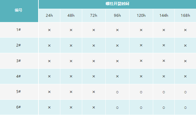 备注:5#、6#样品的螺纹为装上螺钉后产生。将按表 2 处理后的样品放入 50℃烘箱内储存,每隔一定时间取出观察样品各螺柱是否开裂。