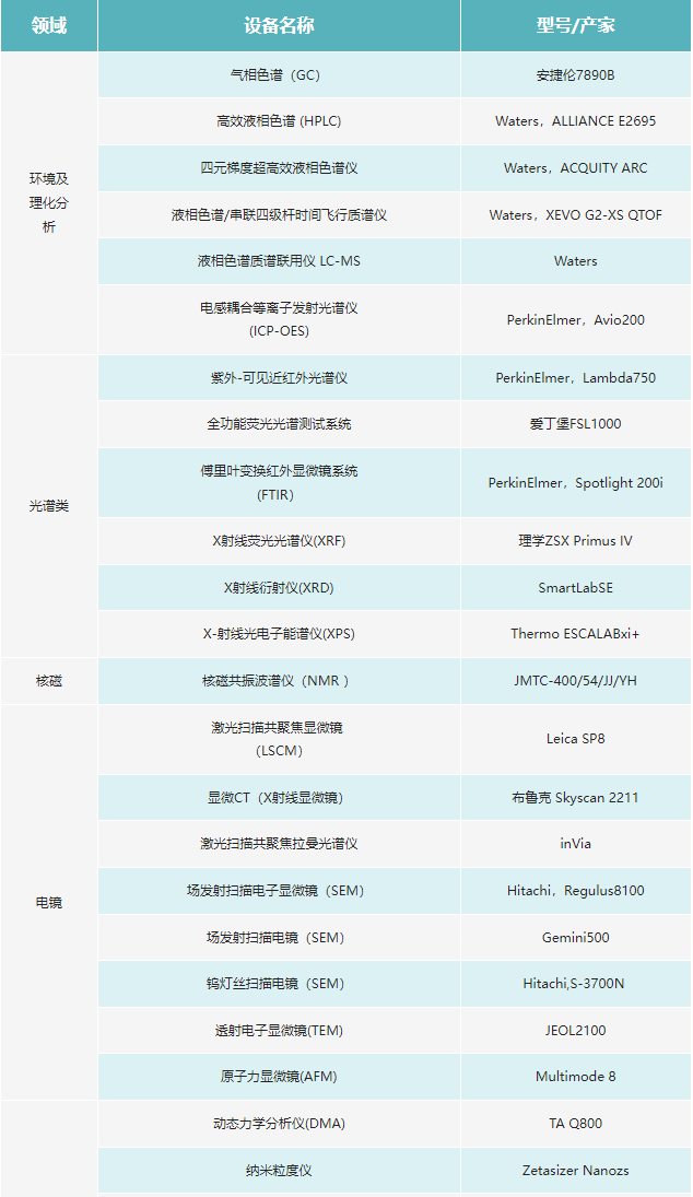 目前分析实验室设色谱分析室、液质分析室、生化分析室、光谱分析室,理化分析室、电镜分析室、XRF分析室、XRD分析室、核磁分析室等9个分析室,可从事有机、无机成分与结构分析,材料的结晶、热学、力学性能和显微结构分析,药物定性、定量分析、荧光检测分析,以及常规的水质检测、食品检测、转基因成分检测、环境污染物分析。