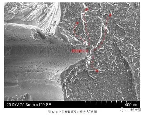 如图 17 所示,开裂源头附近粗糙不平,而螺纹内壁并未观察到显著缺陷。