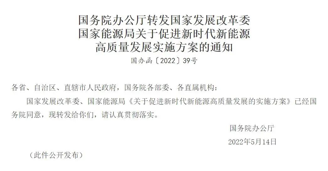 发表时间:2022-06-01 关注:903经国务院同意,近日,国务院办公厅转发国家发展改革委、国家能源局《关于促进新时代新能源高质量发展的实施方案》。(以下简称《实施方案》),旨在锚定到2030年我国风电、太阳能发电总装机容量达到12亿千瓦以上的目标,加快构建清洁低碳、安全高效的能源体系。